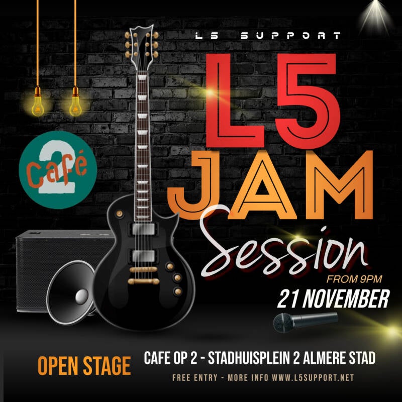 "Het is weer zover! ๐ Pak je instrumenten en kom gezellig meespelen op de L5 Jamsession. Kun je geen instrument bespelen? Geen probleem – kom genieten van de muzikale toppers en talenten uit Almere en omstreken. Een avond vol muziek, sfeer en gezelligheid!"